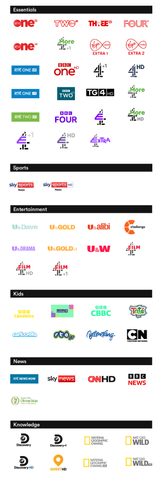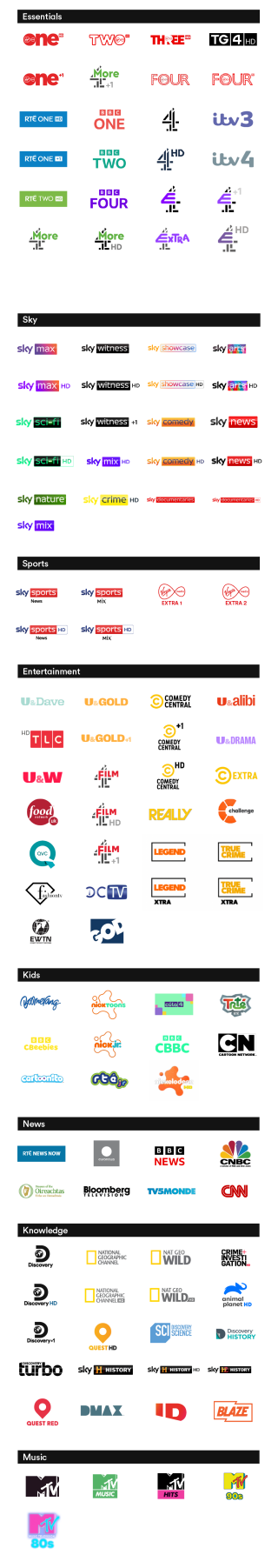 Virgin TV Anywhere is subject to device registration on a maximum of 2 devices in addition to your set top box. Virgin TV Anywhere service includes 80 channels available to watch Out of Home over 3G, 4G and public W-Fi networks. Virgin TV Anywhere requires your device to have iOS7 or above for Apple products & OS.4.0.3 or above for Android, Windows 10 devices & is available to Virgin Media Ireland customers with Virgin Media Ireland TV.