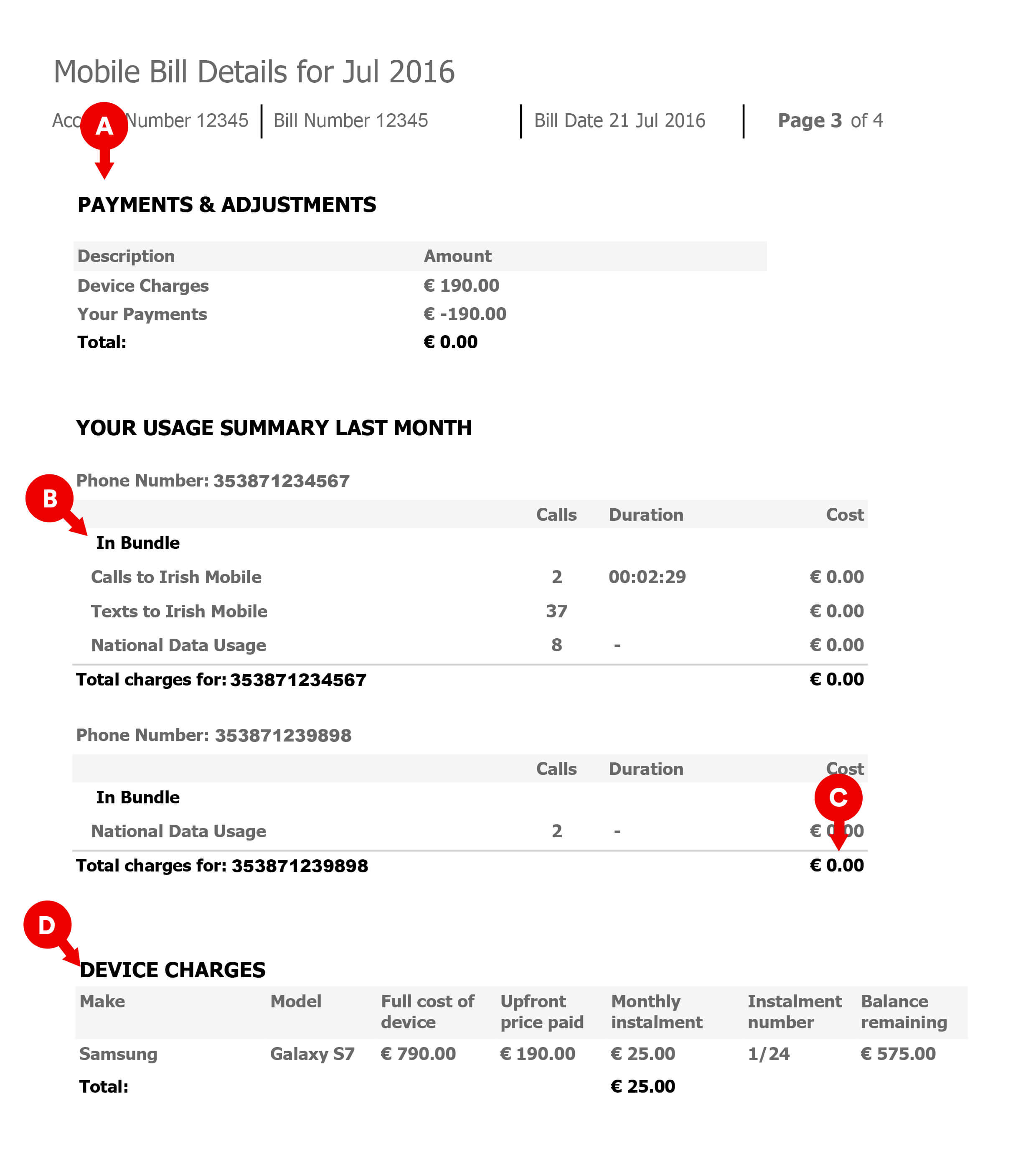 Details of any calls, texts and data you’ve used within your price plan limit.